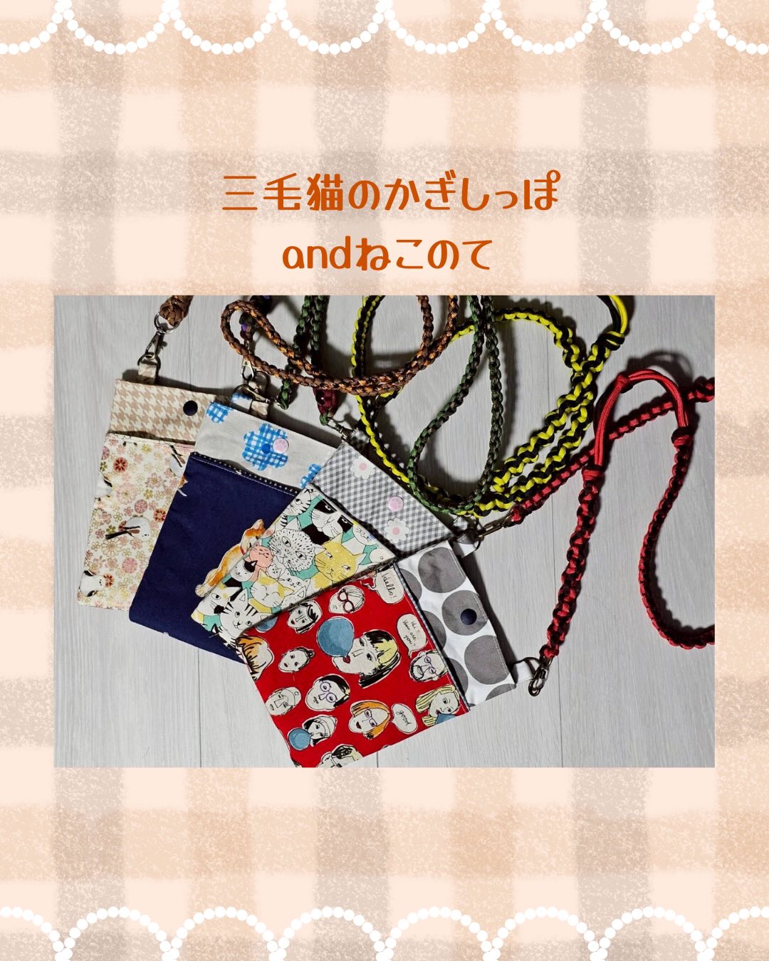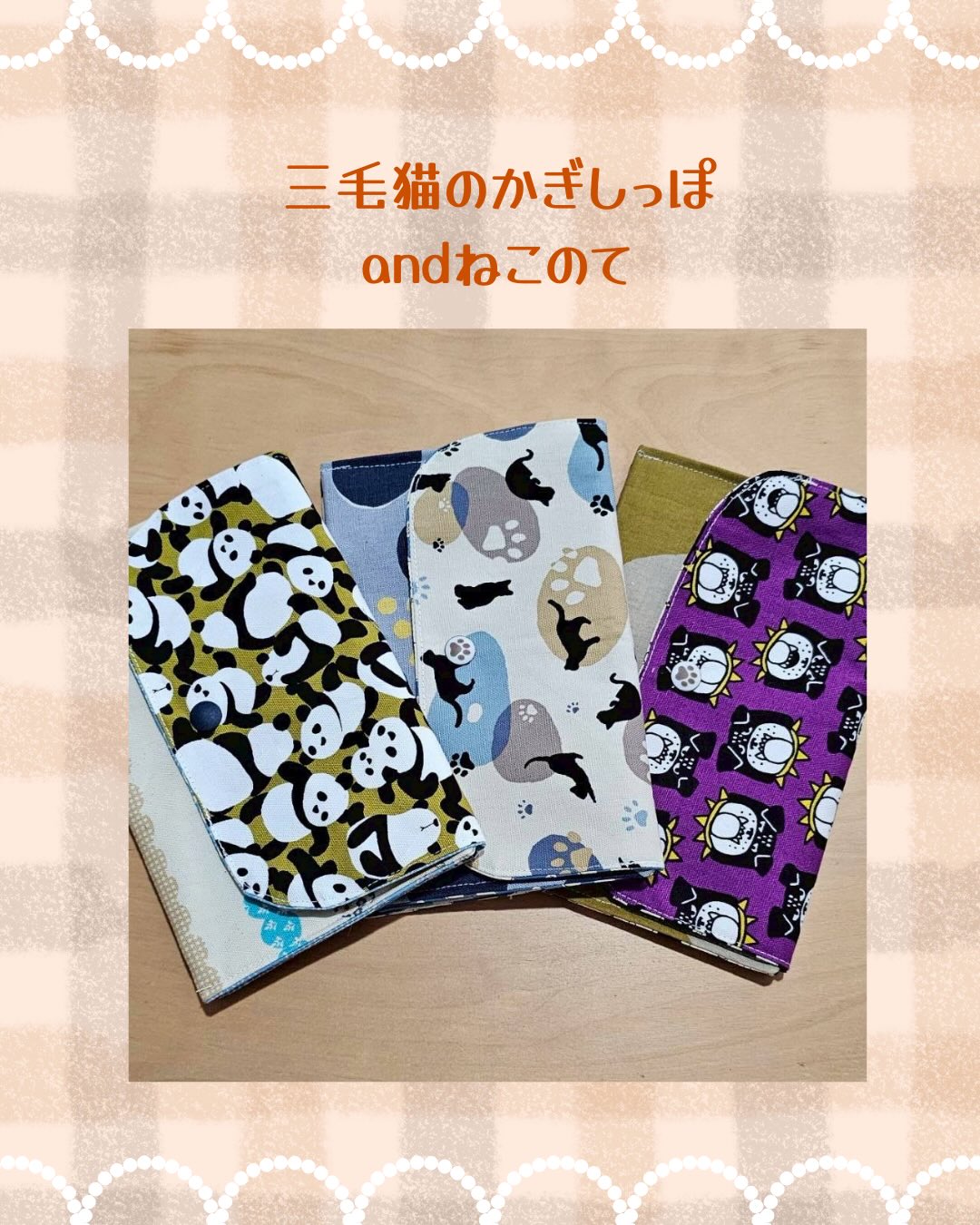 保護犬、保護猫の殺処分ゼロを目指して私達が出来ることをとマルシェでの売り上げの一部を保護団体に寄付する活動をしているため、犬柄、猫柄の生地を基本に作っています。是非お手に取ってみてください。