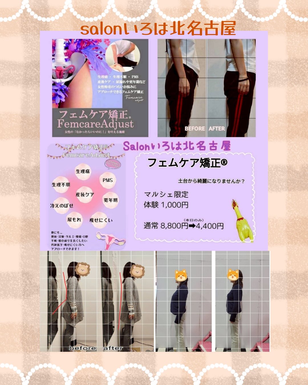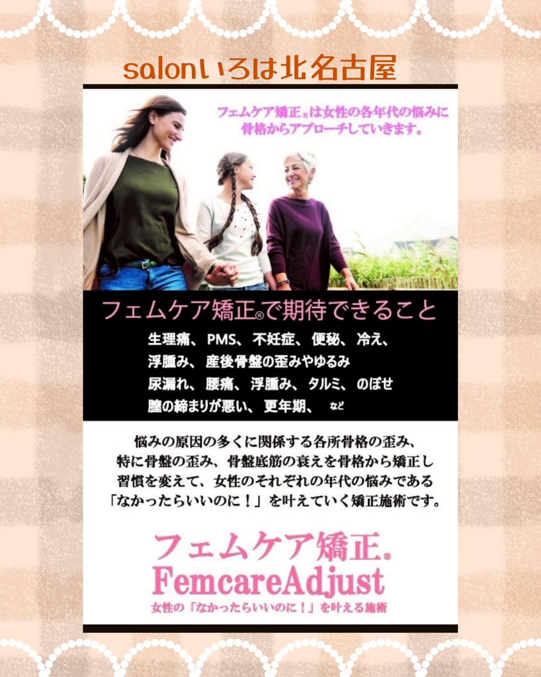 「フェムケア矯正® とは、女性特有のお悩み…例えば生理痛・生理不順・PMS・尿漏れ・お湯漏れ・更年期症状etc……を治療するのではなくそもそも出ない身体に変えていくための骨盤矯正なのです」是非体験してみてください。